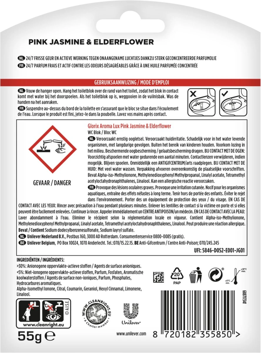 Het Glorix Aroma Lux Toiletblok Pink Jasmine & Elderflower WC Blok geeft 24/7 een heerlijk frisse geur en heeft een actieve werking tegen onaangename geurtjes dankzij geconcentreerde parfumolie. Zo ruikt je toilet altijd heerlijk fris! Bovendien zorgt Glorix Aroma Lux WC Blok bij elke spoelbeurt voor glans en hygiƫnische reiniging, waardoor je iedere dag geniet van een aangenaam geurend en schoon toilet. De hanger is bovendien 100% recyclebaar!