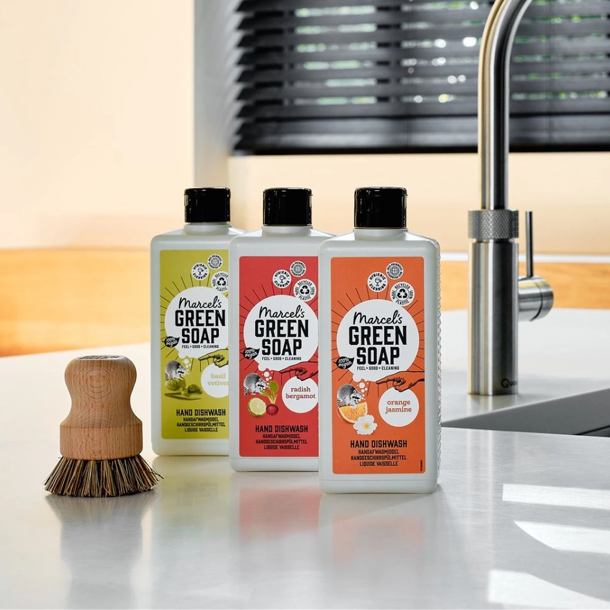 Marcel’s Green Soap afwasmiddel basilicum & vetiver is gemaakt van plantaardige zepen, vegan, minstens 97% biologisch afbreekbaar en komt in een fles van 100% gerecycled plastic. Duurzaam afwasmiddel marcel’s green soap afwasmiddel is gemaakt van plantaardige zepen en dus vriendelijk voor het milieu, je huis Ć©n je lichaam. Verrijkt met essentiĆ«le olie van basilicum en vetiver gras en een heerlijk natuurlijk basilicum & vetiver parfum, zodat afwassen (we durven het bijna niet te zeggen) een echte ‘geurbeleving’ wordt. En terwijl je wordt opgeslokt door die intense ervaring wordt de huid van je handen gelijk lekker verzorgd door het zachte schuim en de verrijkende ingrediĆ«nten. Het doen van de afwas was nog nooit zo ontspannen! tenzij je de vaatwasser aan het werk zet natuurlijk. Gelukkig heeft marcel ook ecologische vaatwastabletten ontwikkeld! bomvol natuurlijke ingrediĆ«nten zoals alle producten van marcel’s green soap bevat ons afwasmiddel geen kleurstoffen, parabenen, fosfaten, chloor, ammonia of zuren. Sterker nog, het afwasmiddel zit bomvol natuurlijke ingrediĆ«nten en is minstens 97% biologisch afbreekbaar. Basilicum & vetiver het frisse en kruidige van basilicum gecombineerd met de elegante en aardse geur van vetiver gras: frisser wordt het niet! leuk detail: volgens de italianen geeft basilicum je vertrouwen en energie. Oppassen dus, want als je eenmaal begint met schoonmaken…